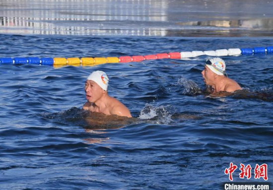 2025年1月1日,在長(zhǎng)春南湖公園,冬泳愛好者破冰在湖水中暢游。當(dāng)天,中外百余名冬泳愛好者齊聚南湖,以冬泳的方式迎接新年。中新社記者 張瑤 攝