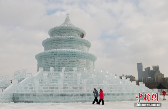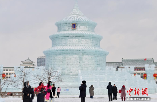1月12日,在長春市的文化廣場上,一座以北京天壇祈年殿為原型的巨型冰雕成為冬日一景。冰雕高約21米,用冰量5010立方米,飛檐、殿頂?shù)葌鹘y(tǒng)建筑細節(jié)均被精準復(fù)刻,陽光下晶瑩剔透,配合紅燈籠冰柱點綴,盡顯中式浪漫韻味,吸引眾多游客前來拍照打卡。中新社記者 張瑤 攝