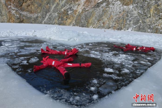 2月5日,吉林省長(zhǎng)春市,一項(xiàng)獨(dú)特的冰浮項(xiàng)目吸引眾多游客前來(lái)體驗(yàn)。在嚴(yán)寒天氣中,參與者身穿醒目的紅色浮力裝備,悠然漂浮于冰面之上,感受別致的冰雪樂(lè)趣。圖為游客在下水前拍照留念。中新社記者 張瑤 攝