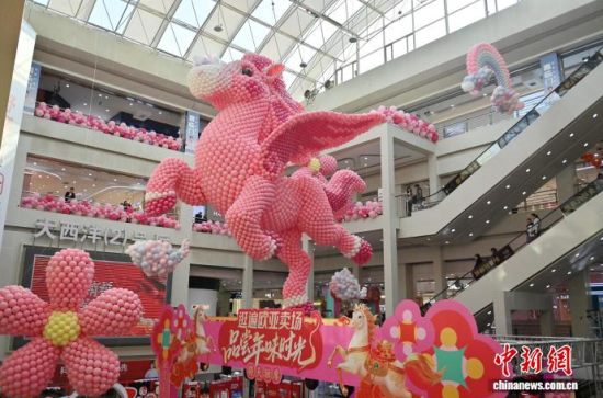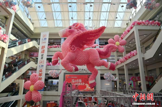 2月11日,吉林長春一商場內(nèi)懸掛用8萬個氣球組成的“瑞馬迎春”裝置,迎接丙午馬年春節(jié)。中新社記者 張瑤 攝